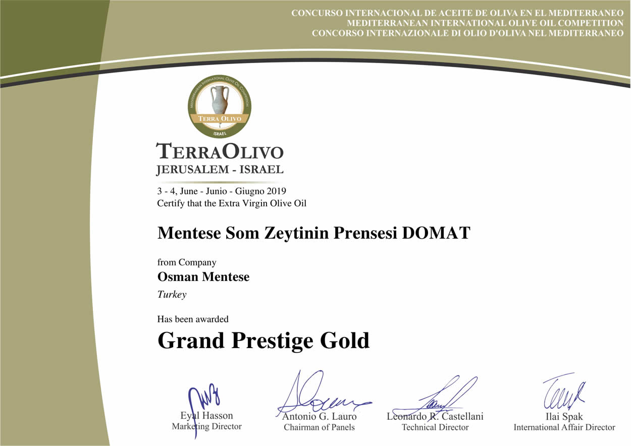 Terra Olive İsrail Kuduste yapılan önemli bir zeytinyağı kalite yarışmasıdır. Bu yıl Domat zeytin çeşidinden ürettiğimiz zeytinyağı i Zeytinin Prensesi Domat ile katıldık üst ödüllerden biri olan GRAND PRESTIGE GOLD ödülünü hak ettik.